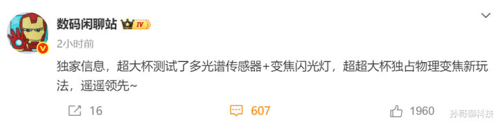 博主数码闲聊站爆料,有一款超大杯手机测试多光谱传感器、变焦闪光灯、超超大杯独占物理变焦新玩法。由于后面紧跟着一句“遥遥领先”,大多数人猜测是华为Mate80系列,但评论区暗示“颠覆性光学影像体验”应该是指小米。卢伟冰此前曾预热过,小米17 Ultra有颠覆光学影像体验。